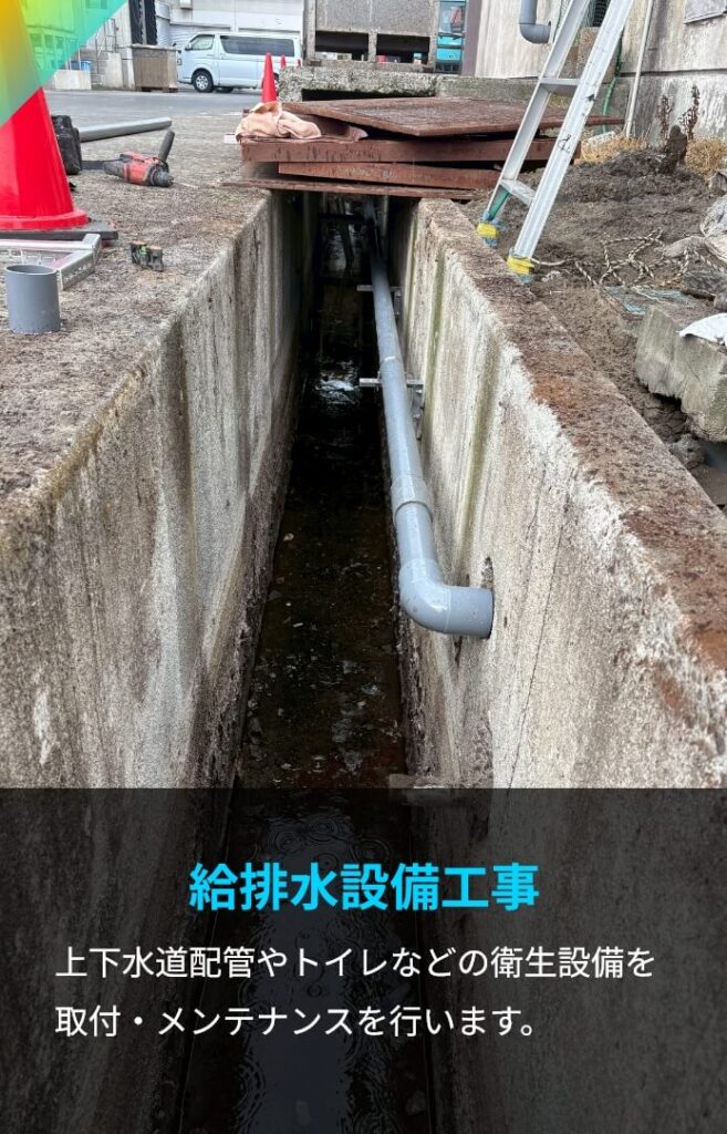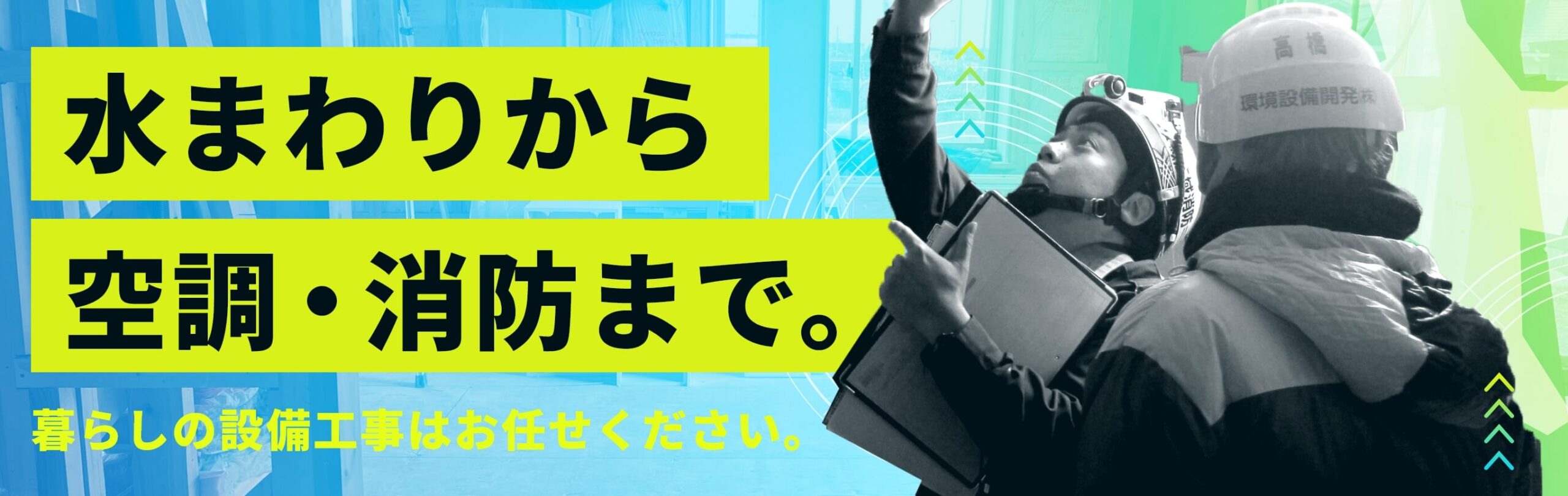 当社は、給排水・空調・ガス・消防設備などを手がけ、住宅から商業施設、公共施設に至るまで幅広い設備工事に対応しています。